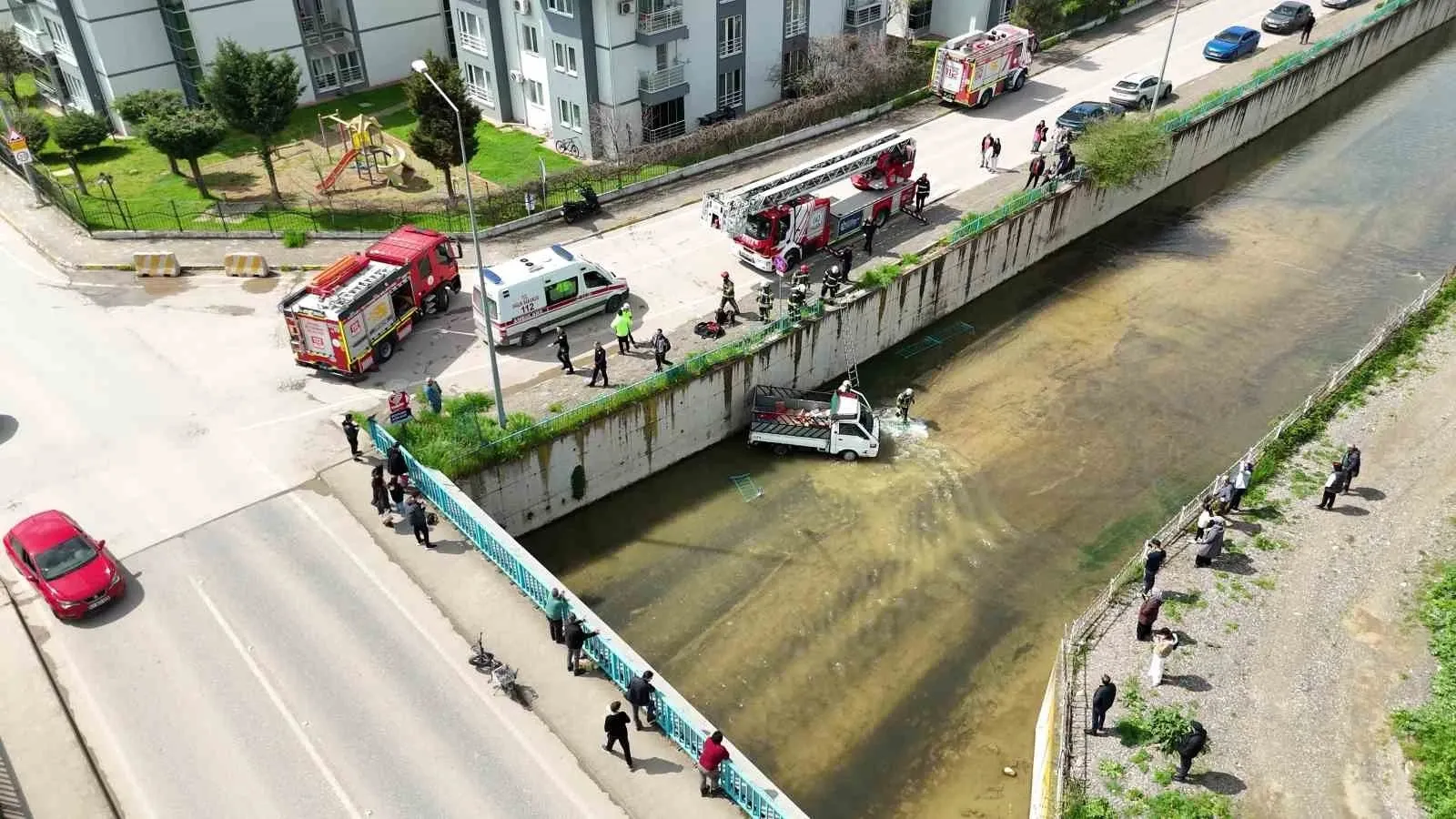 Kamyonetin demir korkulukları kırarak dereye düşme anı, çevredeki bir sitenin güvenlik kamerasına yansıdı. Olay yerindeki müdahale ve çalışmalar dron ile havadan da görüntülendi.