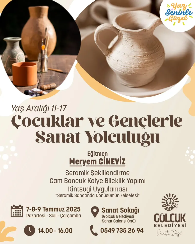 7-8-9 Temmuz tarihlerinde Gölcük Belediyesi Sanat Galerisi önünde gerçekleşecek “Çocuk ve Gençlerle Sanat Yolculuğu” adlı etkinlikte, katılımcılar sanatsal yeteneklerini keşfedecek. Eğitmen Meryem Cineviz rehberliğinde seramik şekillendirme, cam boncuk kolye tasarımı ve Japon kırık porselen sanatına dayanan Kintsugi teknikleri öğretilecek.