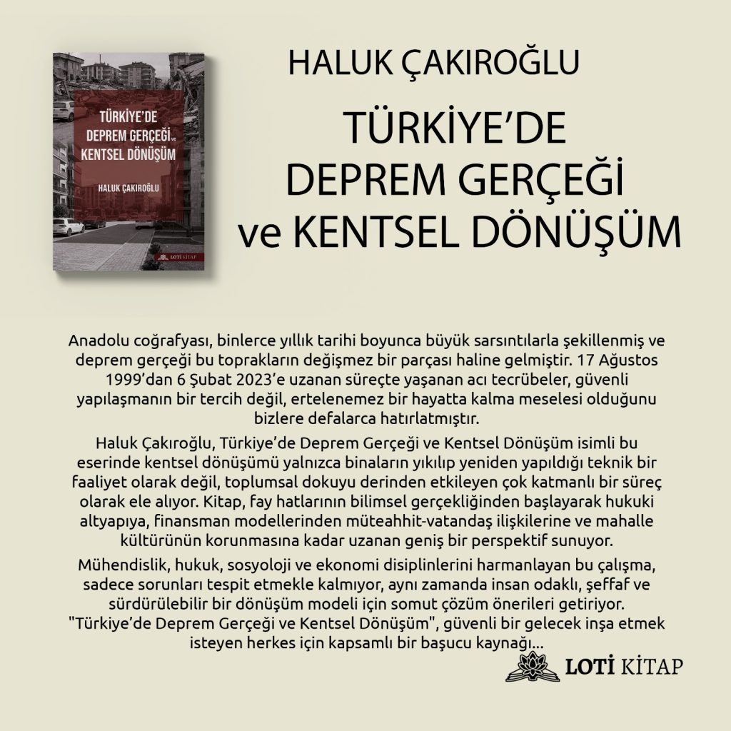 Gölcük’te yaşayan iş adamı ve müteahhit Haluk Çakıroğlu’nun yılların birikimiyle kaleme aldığı “Türkiye’de Deprem Gerçeği ve Kentsel Dönüşüm” adlı kitabı, Loti Kitap etiketiyle yayımlandı. Türkiye’nin en acı tecrübeleri arasında yer alan 17 Ağustos 1999 ve 6 Şubat 2023 depremlerinin ardından güvenli yapılaşmanın artık bir tercih değil, bir zorunluluk olduğuna dikkat çeken Çakıroğlu, Anadolu coğrafyasının tarih boyunca deprem gerçeğiyle şekillendiğini hatırlatıyor. Bu kapsamlı eser, deprem riskinin Türkiye’nin değişmez bir gündemi olduğunu vurgulayarak okuru bilinçli bir tartışma ortamına davet ediyor.